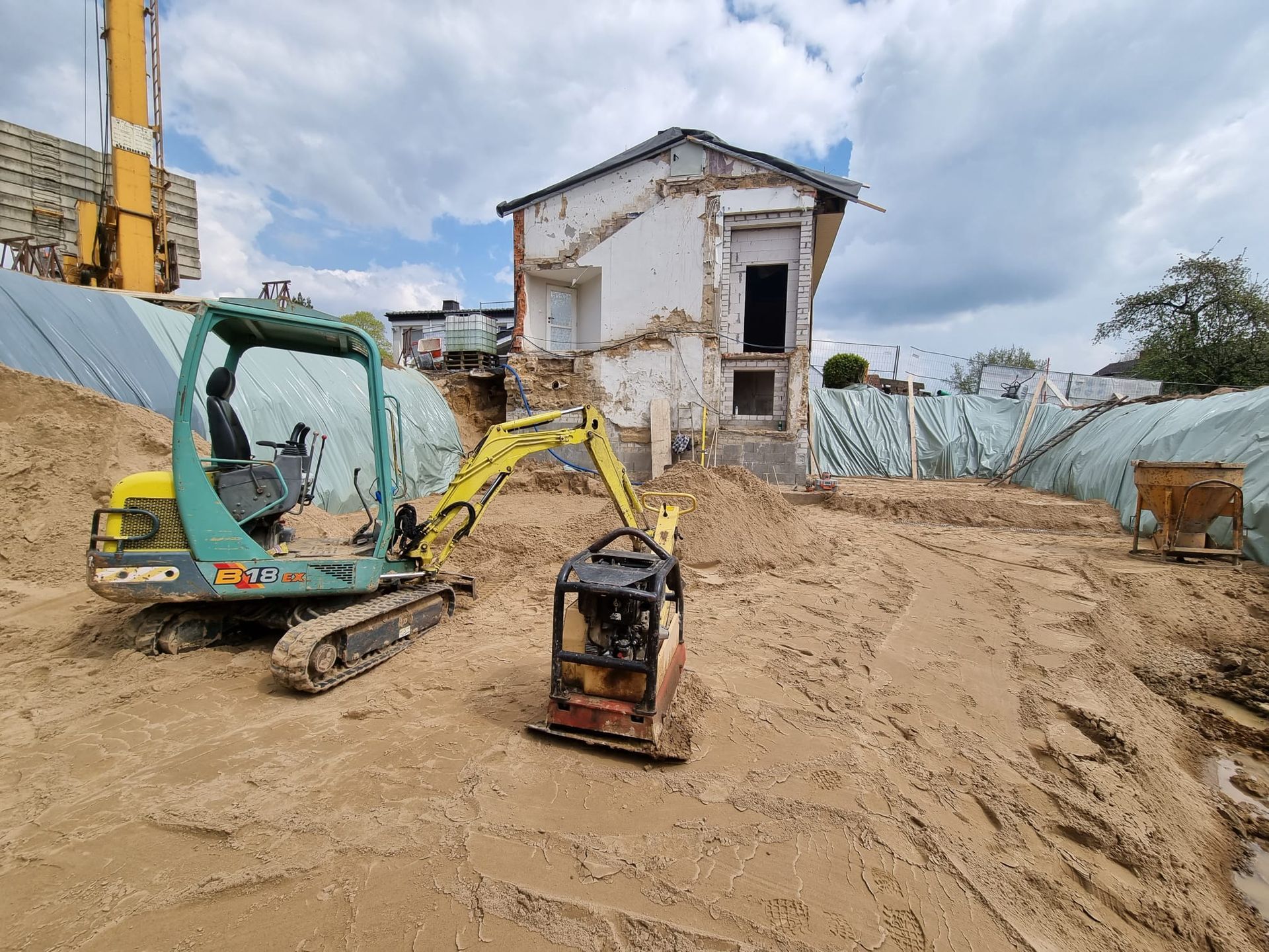 Der Baugrund ist einfach nicht stabil genug, um direkt mit der Gründung zu beginnen. Es muss gut 1 m Erdreich abgetragen werden. Zug um Zug wird die Erde entfernt, mit Sand verfüllt und dieser verdichtet.