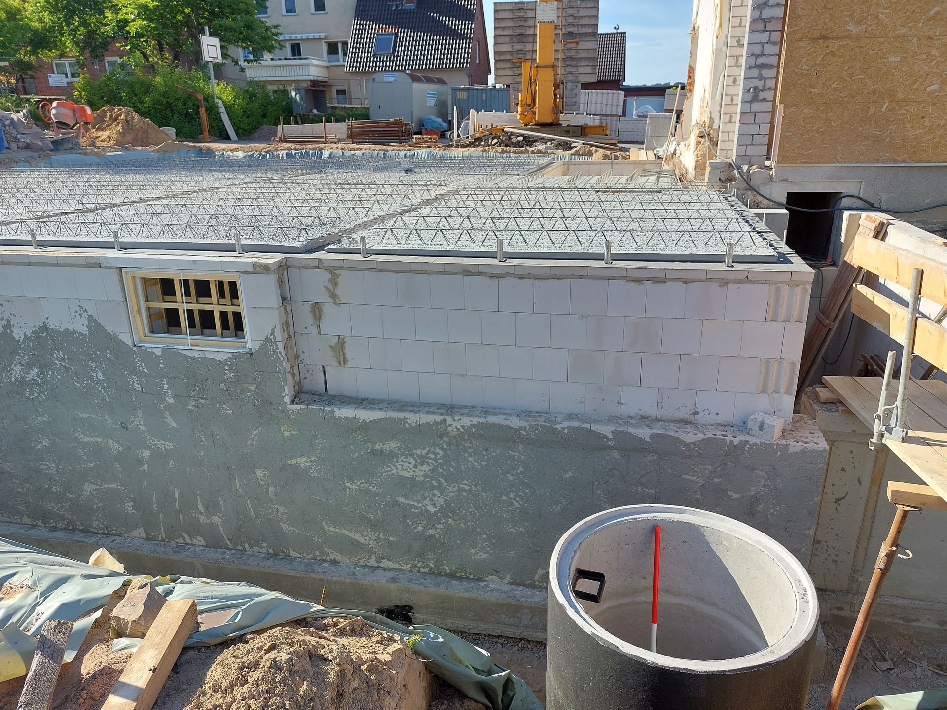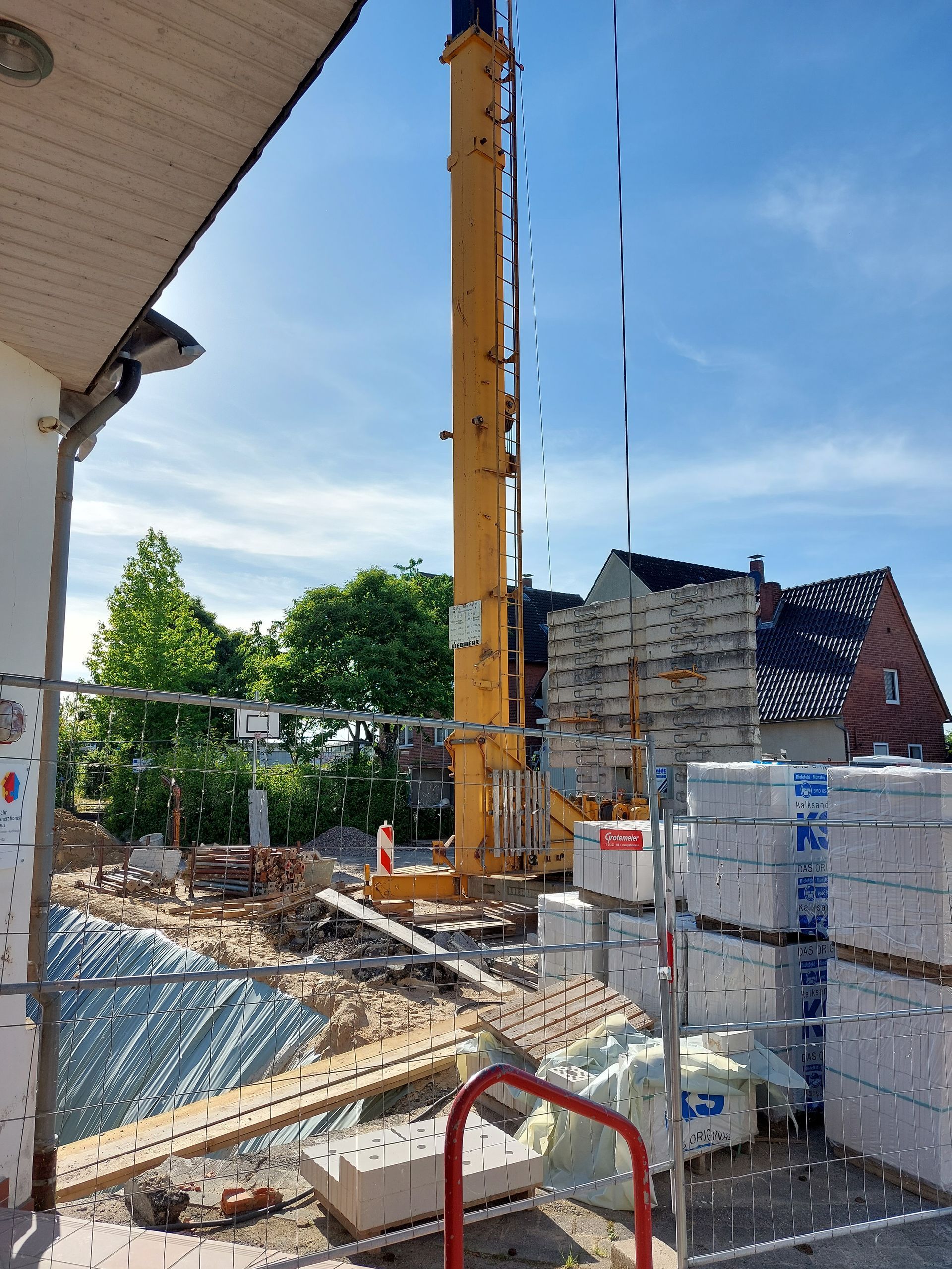 Und dabei holt uns zum ersten Mal die „Krise“ im Bauwesen ein: Vorgesehen war die Kellerwände aus roten Gittersteinen zu erstellen. Da aber aufgrund der Gaspreissteigerungen die meisten Firmen ihre Brennöfen abgestellt haben, gibt es kein Material. Wir müssen umschwenken auf Kalksandsteine.